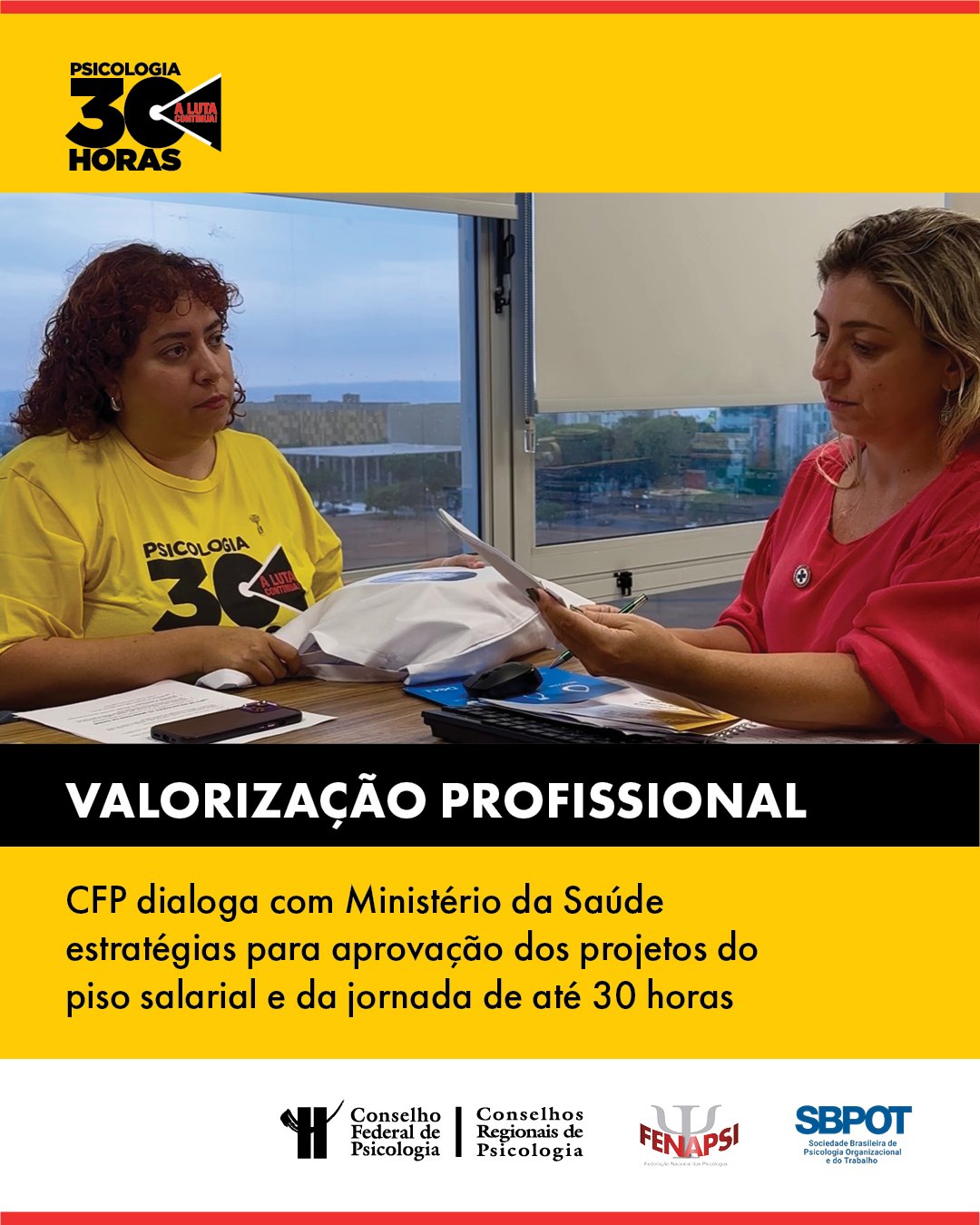 Em 24 de setembro de 2025 (quarta-feira), o Conselho Federal de Psicologia (CFP) participou de audiência na Secretaria de Gestão do Trabalho e da Educação na Saúde, do Ministério da Saúde, para tratar de fontes de custeio dos projetos de lei que estabelecem a jornada semanal de até 30 horas e o piso salarial nacional para psicólogas e psicólogos.