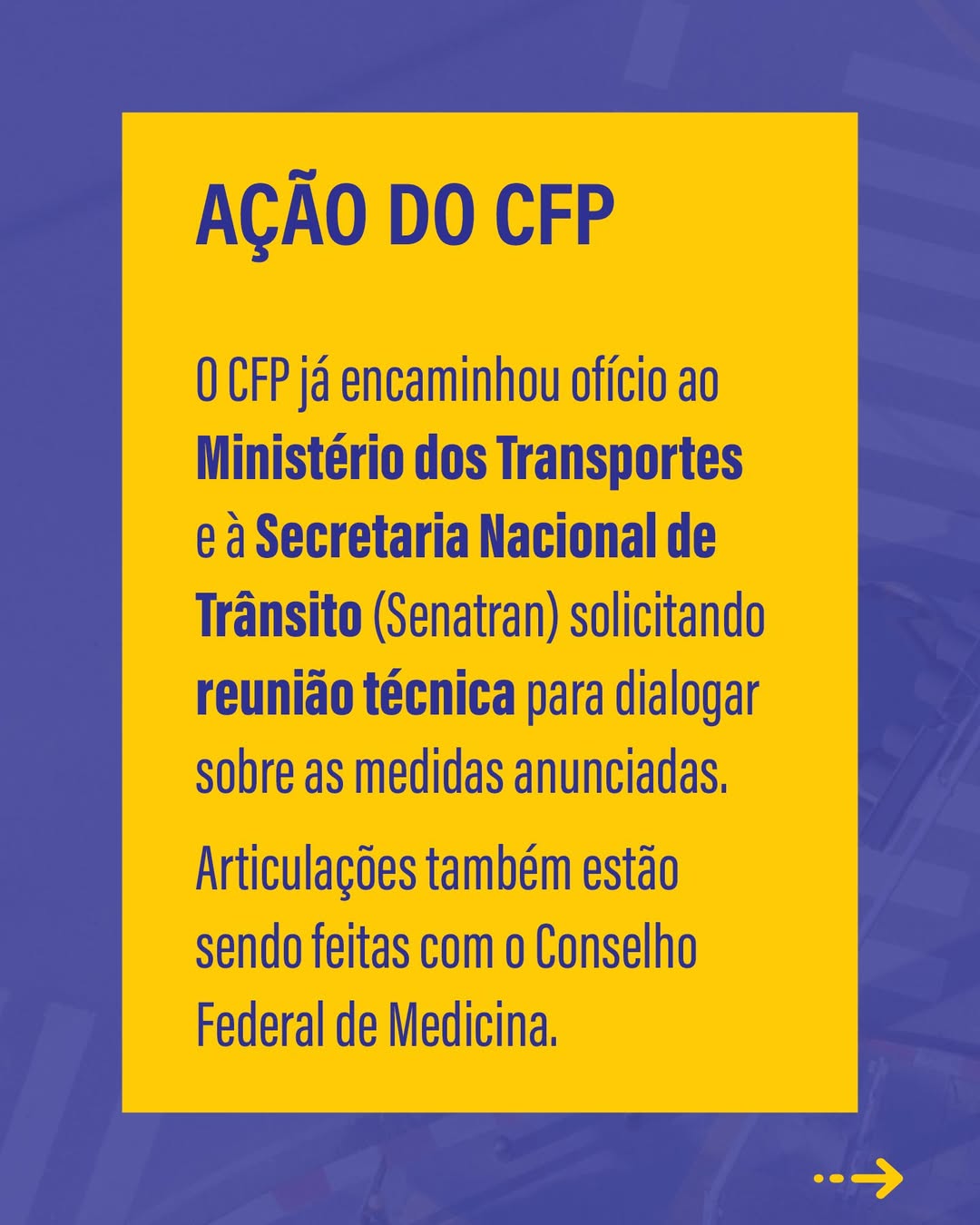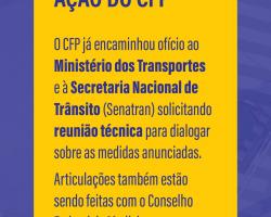 O CFP encaminhou ofício ao Ministério dos Transportes e à Secretaria Nacional de Trânsito (Senatran), solicitando reunião técnica para dialogar sobre a medida e reafirmar que a avaliação psicológica é uma ação essencial de proteção à vida.