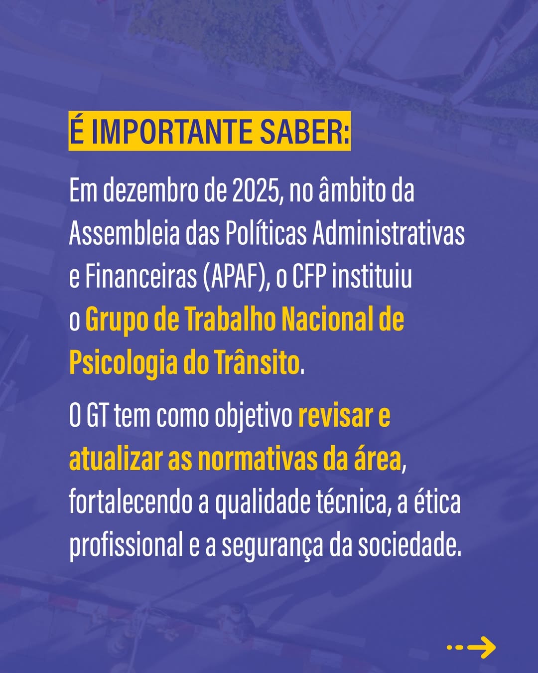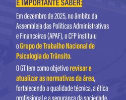Além disso, em dezembro de 2025, no âmbito da Assembleia das Políticas Administrativas e Financeiras (APAF), foi criado o Grupo de Trabalho Nacional de Psicologia do Trânsito, com o objetivo de revisar e atualizar as normativas que orientam a atuação da Psicologia nessa área, fortalecendo a qualidade técnica, a ética profissional e a segurança da sociedade.