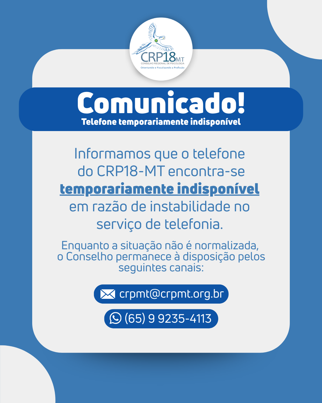 O Conselho Regional de Psicologia da 18ª Região de Mato Grosso (CRP18-MT) informa que seu telefone institucional encontra-se temporariamente indisponível em razão de instabilidade no serviço de telefonia.