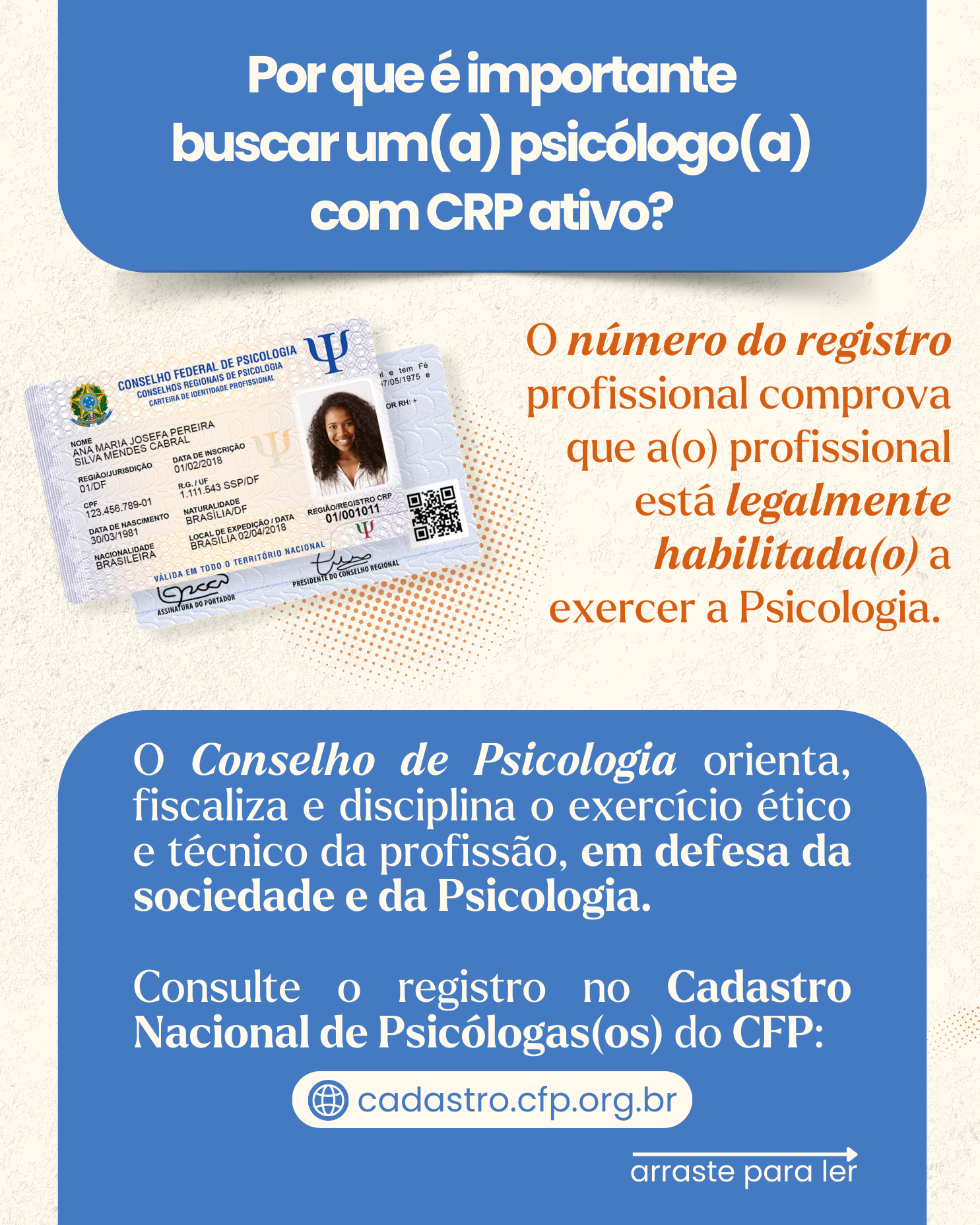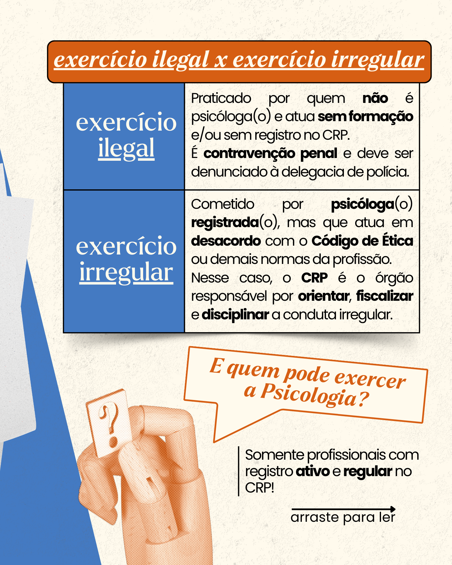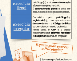É importante diferenciar o exercício ilegal das infrações éticas cometidas por profissionais regularmente inscritas(os) no CRP. Quando a atuação é realizada por psicóloga(o) com registro ativo, eventuais irregularidades são tratadas como questões ético-disciplinares, analisadas e julgadas pelo Conselho, que possui a atribuição legal de orientar, fiscalizar e, quando necessário, aplicar sanções, sempre garantindo o direito ao contraditório e à ampla defesa. Para preservar a segurança de quem busca atendimento psicológico, a população deve sempre conferir se a(o) profissional possui número de registro junto ao CRP e Carteira de Identidade Profissional válida.