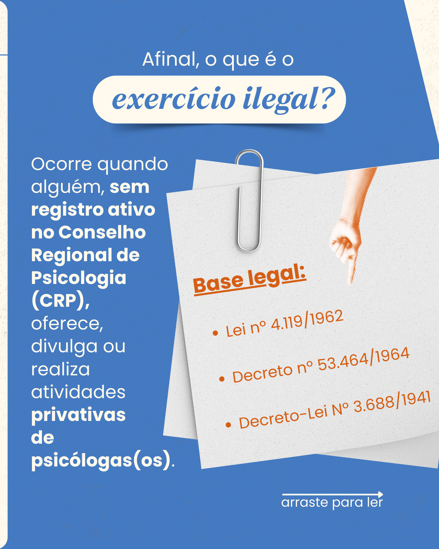 O Conselho Regional de Psicologia da 18ª Região (CRP18-MT) reforça à sociedade mato-grossense que o exercício ilegal da Psicologia constitui contravenção penal e representa um grave risco à saúde mental da população. Configura exercício ilegal quando uma pessoa sem formação em Psicologia e/ou sem registro ativo no Conselho oferece, divulga ou realiza atividades privativas de psicólogas(os), em desacordo com a Lei nº 4.119/1962, o Decreto nº 53.464/1964 e o Decreto-Lei nº 3.688/1941. Nessas situações, além de colocar em risco quem busca atendimento, há violação direta das normas que regulam a profissão e protegem a sociedade.