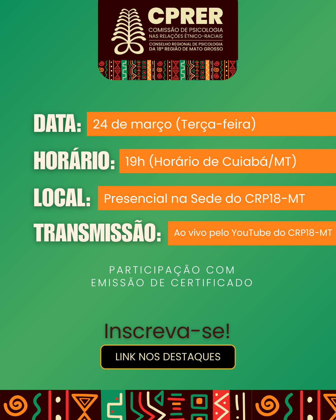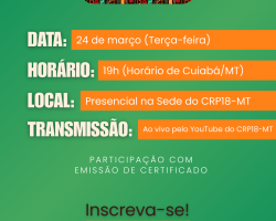 Local: Sede do CRP18-MT (Presencial) e YouTube (Online).