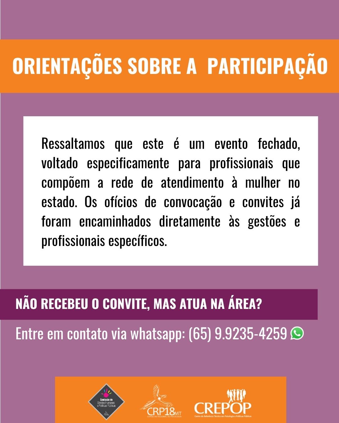 Caso você seja um profissional de psicologia que atua diretamente nessa rede e não tenha recebido o ofício, entre em contato com a Assessoria de Plenário do CRP18-MT, Tenylle Nolasco, via WhatsApp: (65) 9.9235-4259. A assessoria realizará o intermédio necessário para viabilizar sua participação.