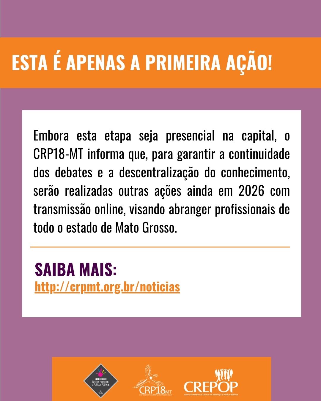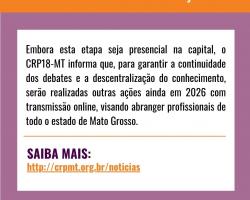 Atenção: Embora esta etapa seja presencial na capital, o CRP18-MT informa que, para garantir a continuidade dos debates e a descentralização do conhecimento, serão realizadas outras ações ainda em 2026 com transmissão online, visando abranger profissionais de todo o estado de Mato Grosso.