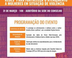 O Conselho Regional de Psicologia da 18ª Região (CRP18-MT), por meio de sua Comissão de Direitos Humanos e Políticas Públicas, realiza no próximo dia 31 de março de 2026 o evento "Tecendo Redes: Atuações das Psicólogas que atendem Mulheres em Situação de Violência". A ação acontecerá das 14h às 17h, de forma exclusivamente presencial, no auditório da sede do Conselho em Cuiabá.