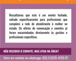 Ressaltamos que este é um evento fechado, voltado especificamente para profissionais que compõem a rede de atendimento à mulher no estado. Os ofícios de convocação e convites já foram encaminhados diretamente às gestões e profissionais específicos.