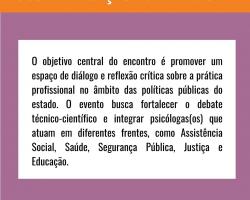O objetivo central do encontro é promover um espaço de diálogo e reflexão crítica sobre a prática profissional no âmbito das políticas públicas do estado. O evento busca fortalecer o debate técnico-científico e integrar psicólogas(os) que atuam em diferentes frentes, como Assistência Social, Saúde, Segurança Pública, Justiça e Educação.