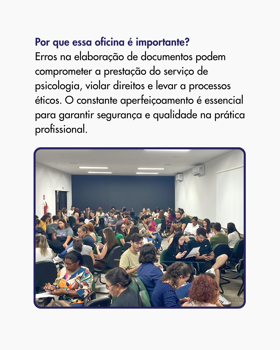 Com o propósito de fortalecer práticas profissionais orientadas pelo rigor técnico e pelo compromisso ético, o Conselho Regional de Psicologia da 18ª Região (CRP18-MT), por meio da Comissão de Orientação e Fiscalização (COF), promoveu em 13 de outubro a Oficina de Produção de Documentos Psicológicos, realizada no Auditório da Universidade do Estado de Mato Grosso, em Sinop (MT). A atividade reuniu psicólogas(os) e estudantes da região, fomentando reflexão e atualização sobre a elaboração de documentos técnicos no exercício profissional.
