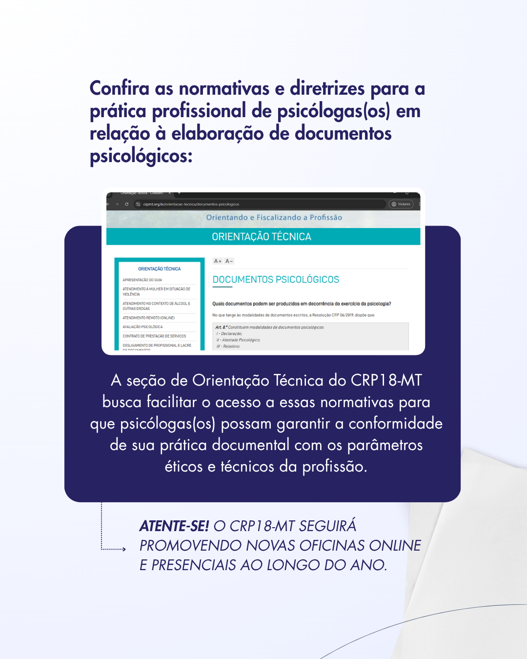 Orientação Técnica: acesse a seção “Orientação Técnica” no site do CRP18-MT para conteúdos e canais de contato.