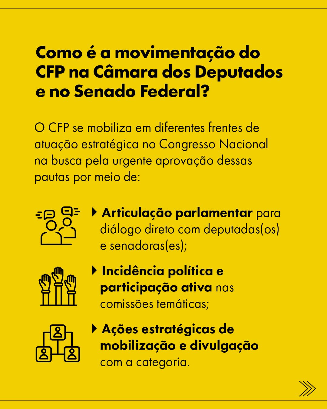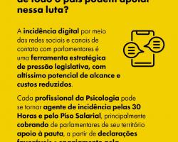 De acordo com as informações da campanha, o CFP atua em diferentes frentes estratégicas no Congresso Nacional, por meio de articulação parlamentar, incidência política e participação ativa em comissões temáticas, além de ações de mobilização e divulgação junto à categoria. A orientação é que psicólogas(os) de todo o país fortaleçam a mobilização também no ambiente digital, utilizando redes sociais e canais de contato para dialogar com parlamentares de seus territórios, cobrando apoio público, declarações favoráveis e engajamento pela aprovação dos projetos de lei.
