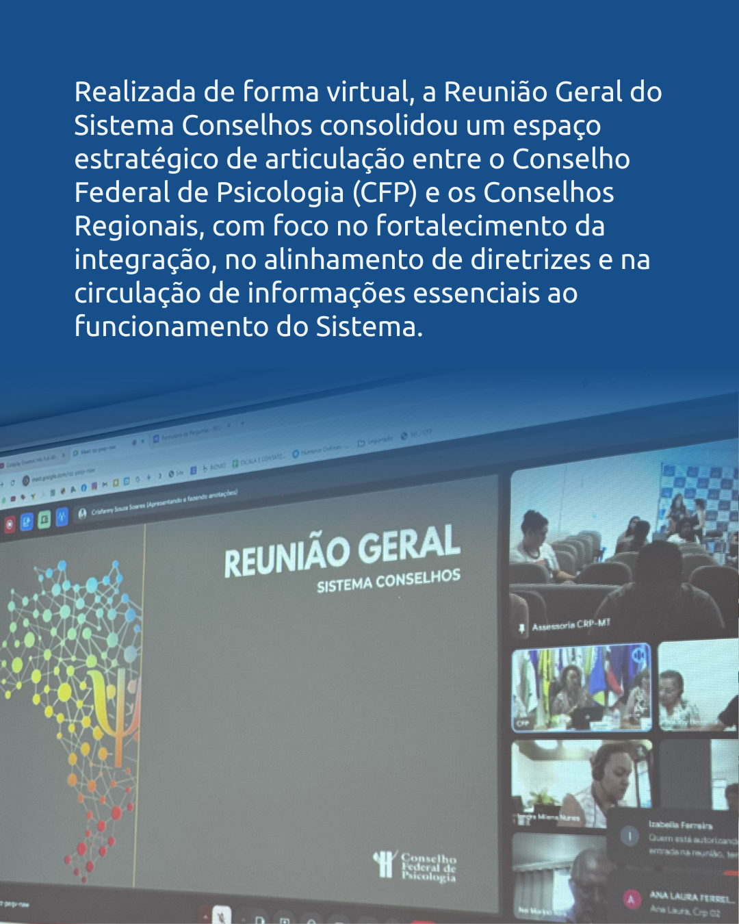 Realizada de forma virtual no dia 7 de novembro de 2025, das 9h30 às 17h (horário de Brasília), a Reunião Geral do Sistema Conselhos consolidou um espaço estratégico de articulação entre o Conselho Federal de Psicologia (CFP) e os Conselhos Regionais, com foco no fortalecimento da integração, no alinhamento de diretrizes e na circulação de informações essenciais ao funcionamento do Sistema. O encontro também reafirmou a função precípua do Sistema Conselhos de Psicologia de orientar, disciplinar e fiscalizar o exercício profissional, destacando a centralidade de temas de governança, integridade e gestão estratégica para uma atuação ética, transparente e articulada em todo o país.
