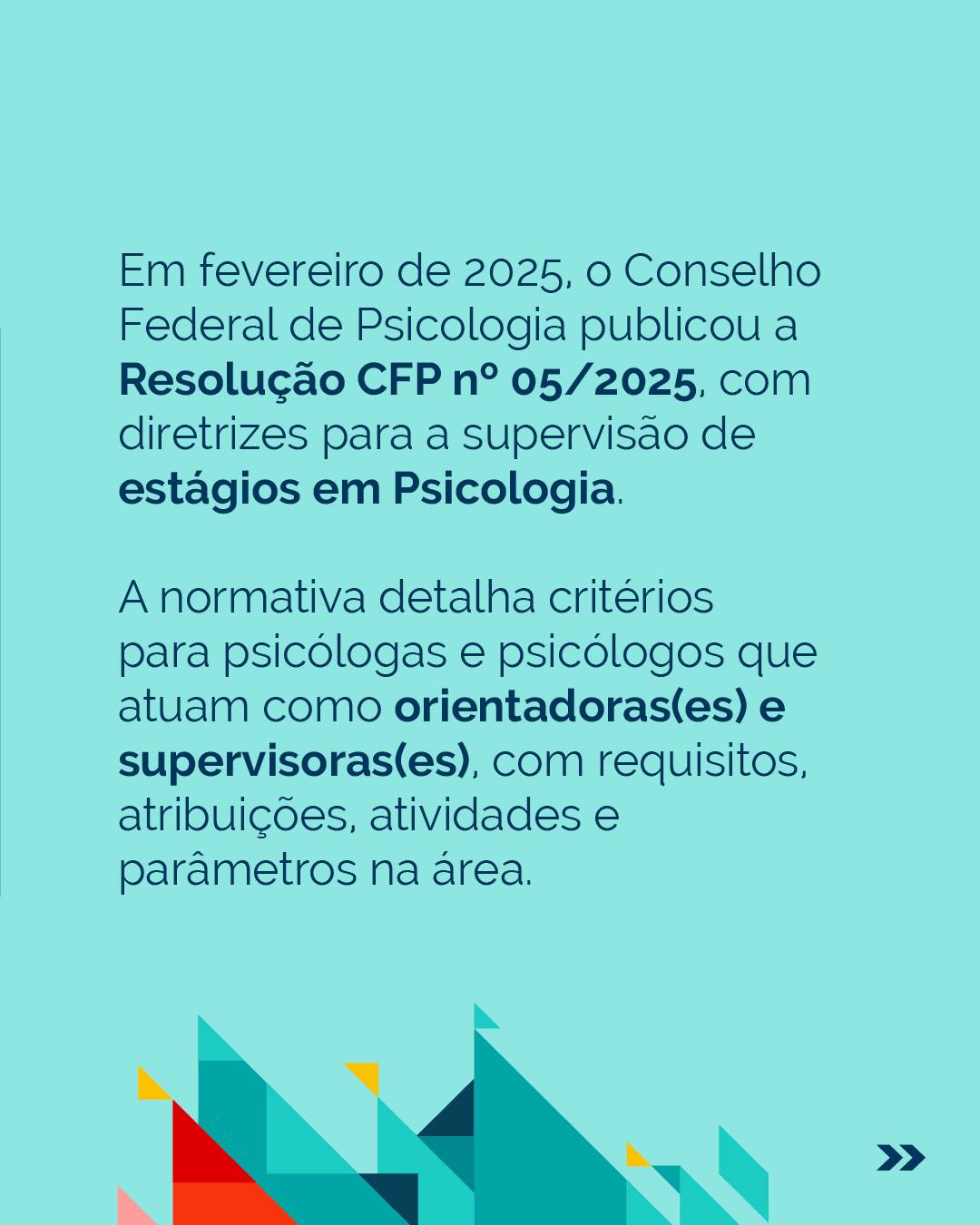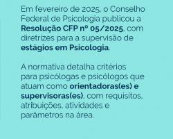 Em fevereiro de 2025, o Conselho Federal de Psicologia publicou a Resolução CFP nº 05/2025, com diretrizes para a supervisão de estágios em Psicologia. A normativa detalha critérios para psicólogas e psicólogos que atuam como orientadoras(es) e supervisoras(es), com requisitos, atribuições, atividades e parâmetros na área.