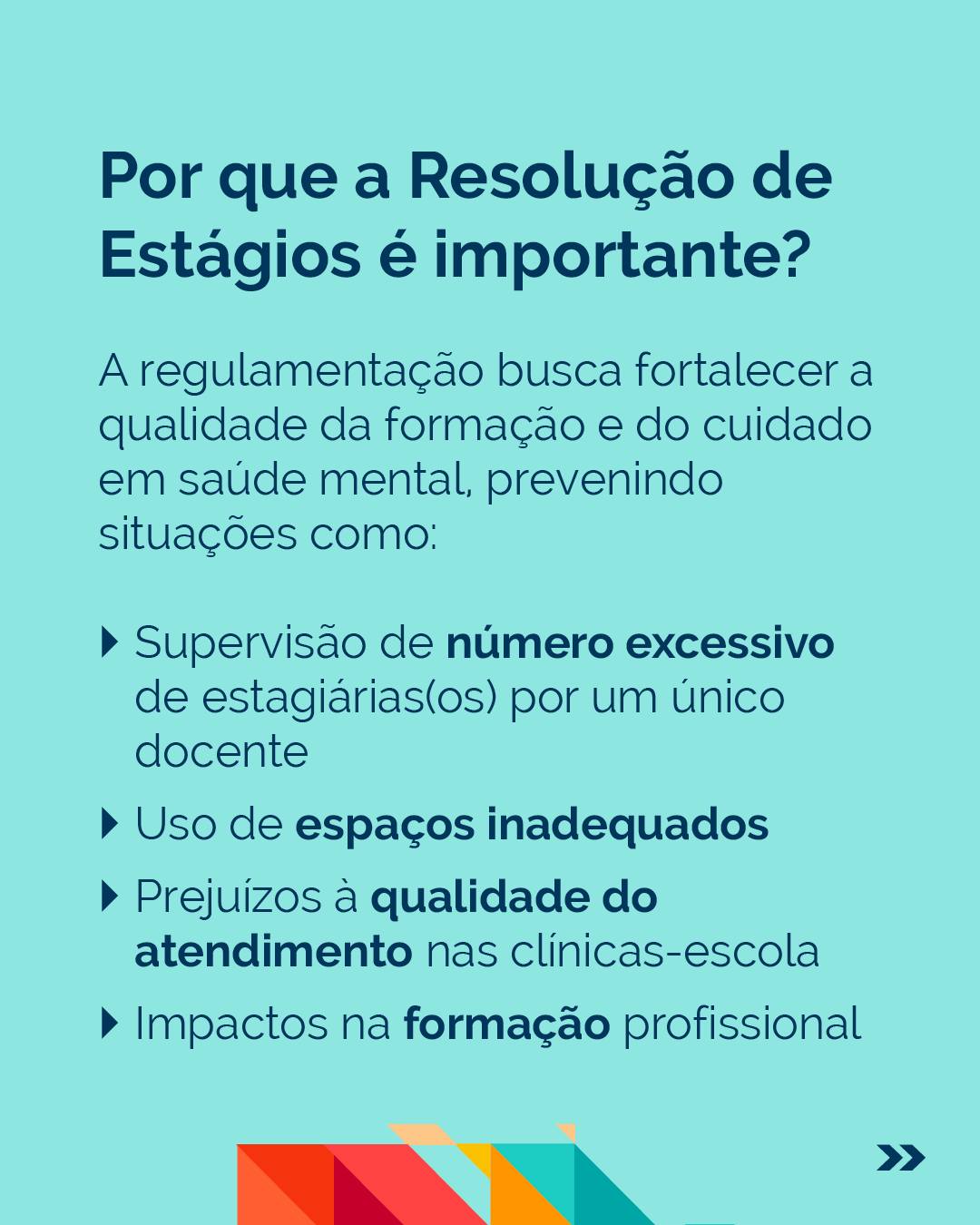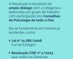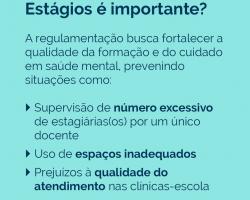O Conselho Federal de Psicologia segue atuante em defesa da Resolução de Estágios e da qualidade do cuidado em saúde mental no Brasil. A regulamentação da área busca coibir práticas como: supervisão de um número excessivo de alunos por uma única docente; utilização de espaços impróprios; impactos na qualidade do serviço oferecido nas clínicas-escolas; e impactos na qualidade da formação profissional
