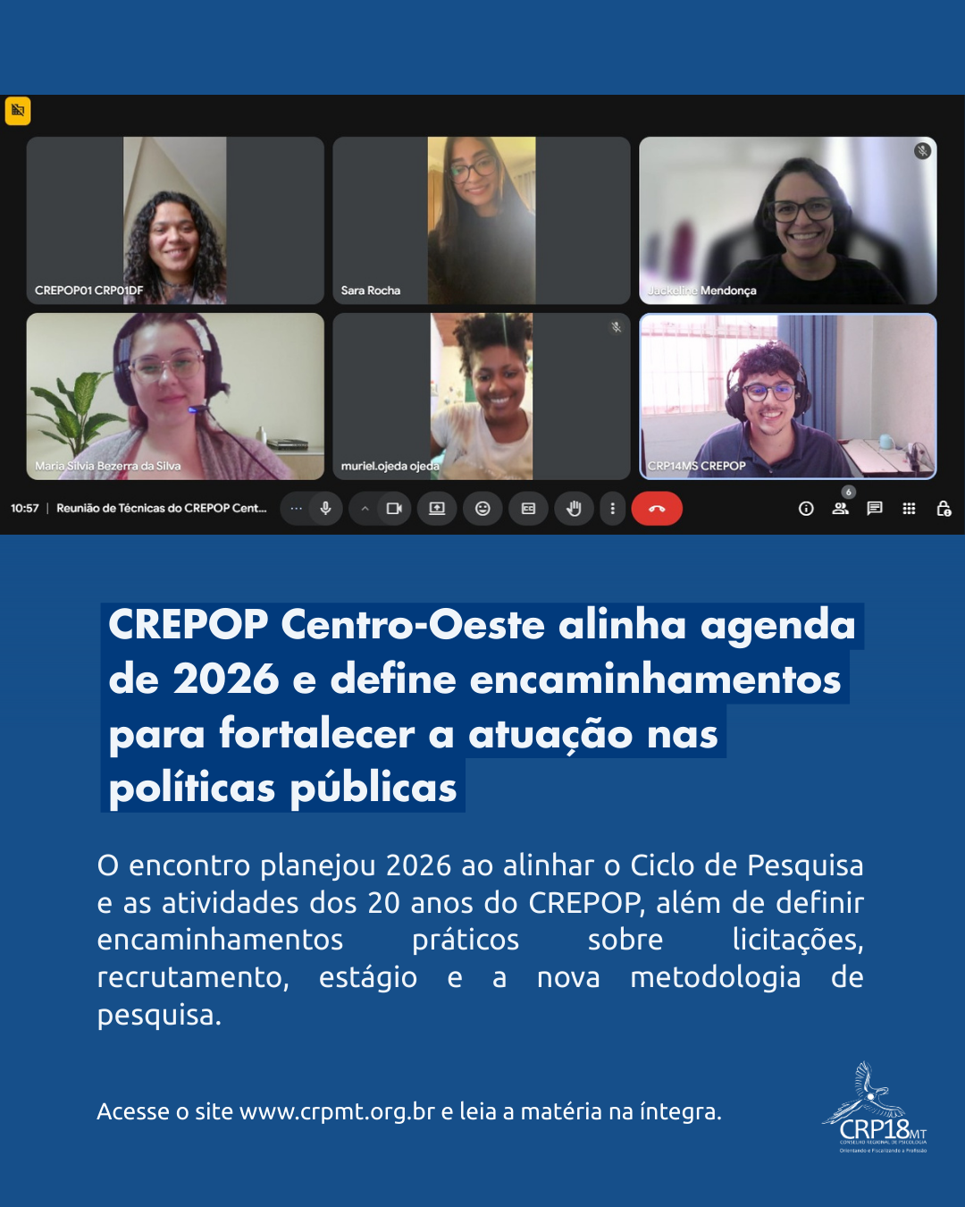 O CRP18-MT, por meio do CREPOP, reafirma o compromisso com a articulação regional e com o aprimoramento permanente das práticas, contribuindo para uma Psicologia qualificada, ética e socialmente referenciada em Mato Grosso e em todo o país.